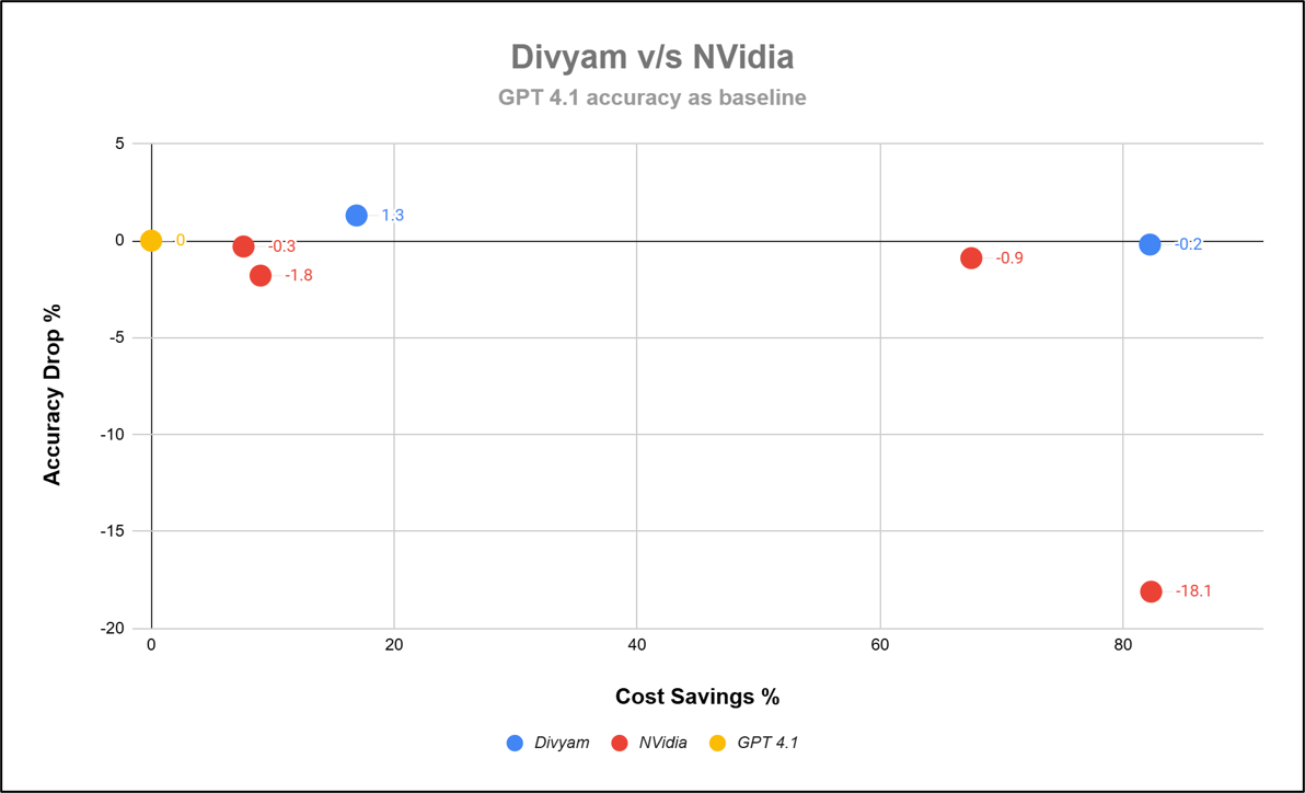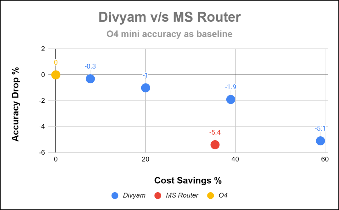 In cases where Divyam has chosen API based LLMs for your application, and you are wondering if you are still at your peak Cost benefit ratio, Divyam’s evaluation engine has you covered . The evaluator runs in the background and continuously does AB testing with earlier cheaper versions of the LLM models so that you always have an almost equal or greater artificial intelligence analysis performance index for your application.